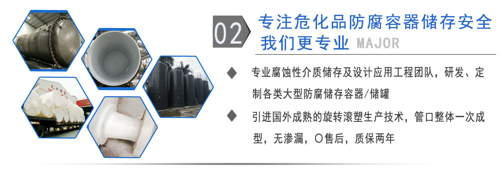 公司有鋼襯塑PE/PO、PE全塑、碳鋼、不銹鋼四大系列100多個品種,專注于常壓儲存容器生產,其產品包括鋼襯塑儲罐管口一體成型PE儲罐、碳鋼儲罐、不銹鋼儲罐、反應釜、攪拌罐、離子交換柱、鋼襯PE/PO儲罐、塑料儲罐鹽酸儲罐硫酸儲罐等等。更大限度滿足廣大客戶的各種需求,同時可以根據客戶的需要加工定制各種防腐設備。